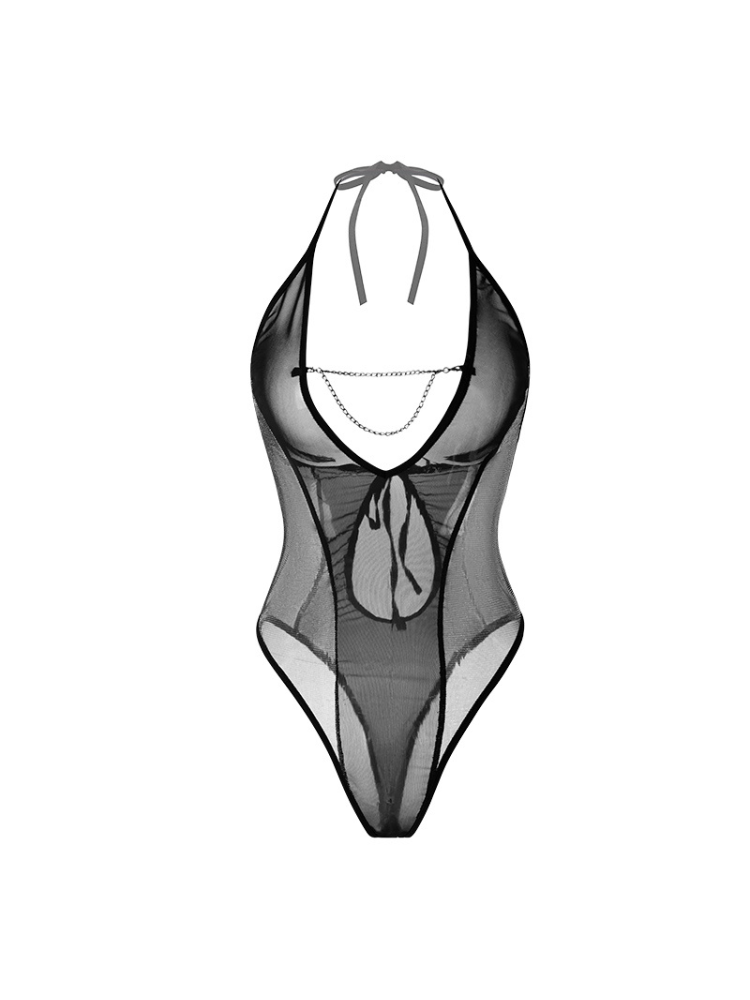 This sheer mesh halter bodysuit blends bold and delicate details for an alluring look. Featuring metallic chain accents and an open-back design with a bow tie, this piece adds a touch of charm to any occasion. The lightweight fabric and high-cut leg openings ensure a flattering fit while keeping you comfortable.