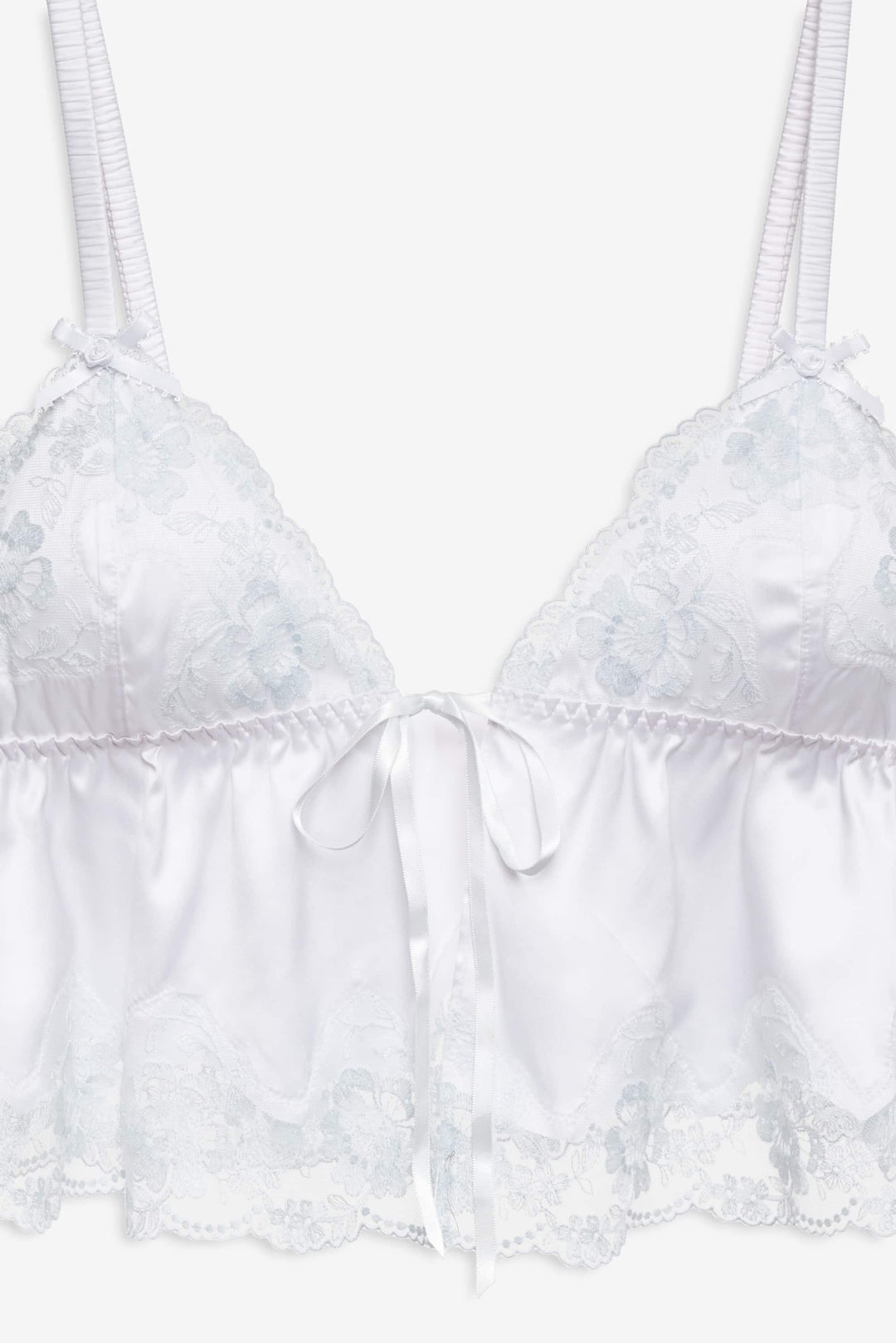 Designed to blur the lines between lingerie and daywear, the Jaden sleep top was made to be worn in and out. This open-front cami is crafted in a sleek satin and adorned with vintage-inspired lace trims and decorative bows.