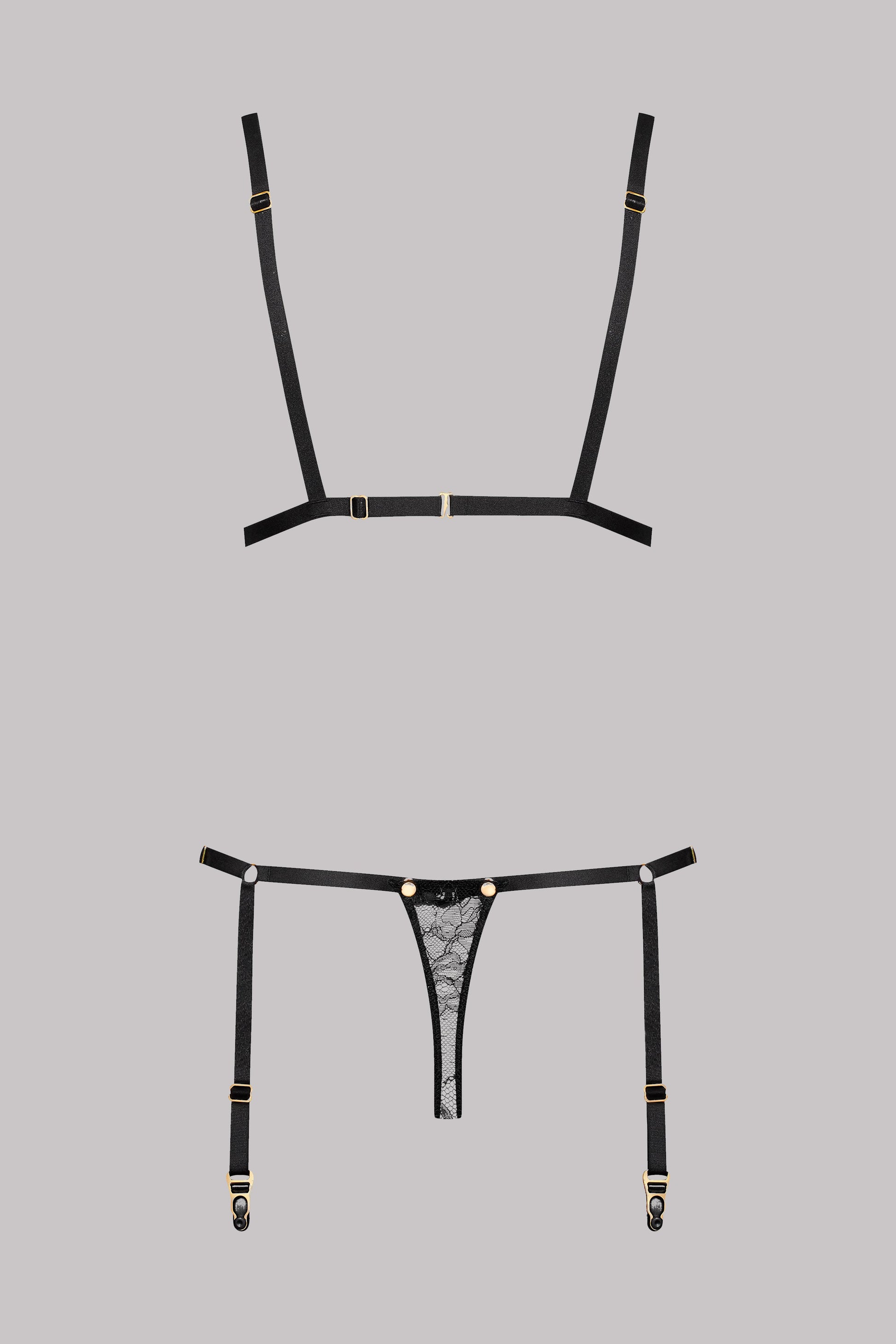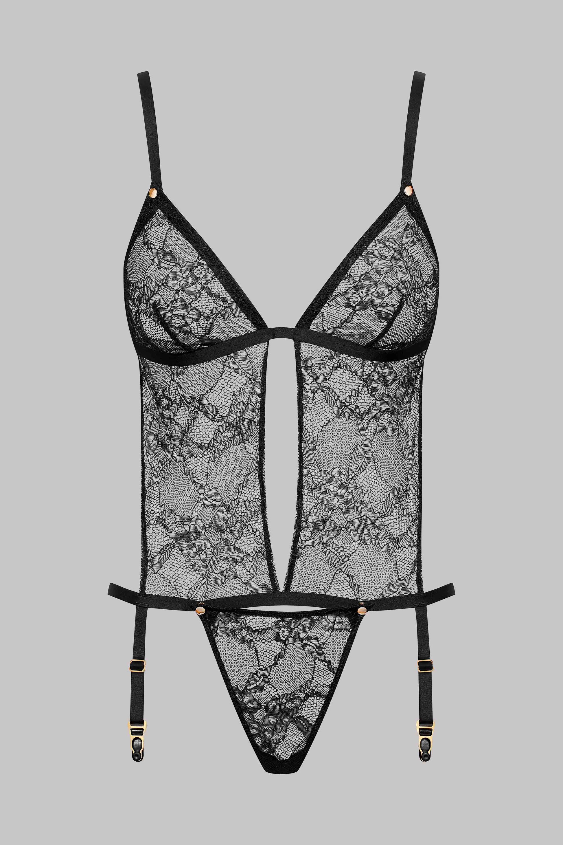 Sheer stretch lace thong bodysuit. Triangle bra and thong opened front to back with magnetic gold press-studs. Elasticated fully adjustable straps and waist. Four adjustable suspenders with gold accents.